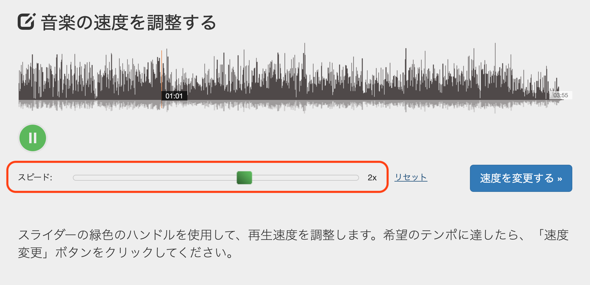 耳コピ用に速度を落としたり、練習用音源(高速音源にあわせて演奏)として速度を上げたりすることができます。