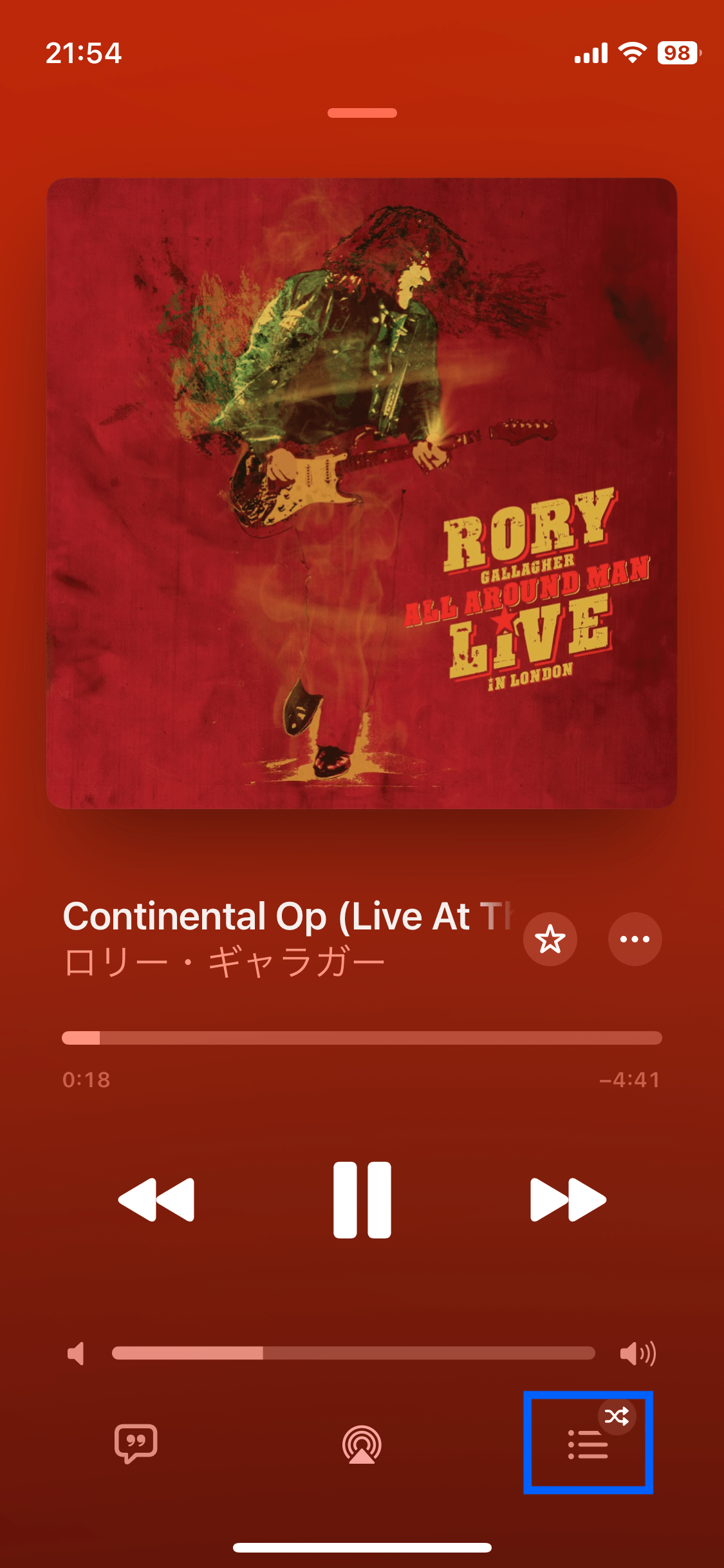 再生を停止し再度シャッフル再生を開始すると、削除した曲がまた一覧に表示されるようになります。シャッフル再生の都度この手順を実行するのは面倒かもですが、手軽に実行できる除外方法です。都度一覧から削除するのが面倒な場合、以下の「特定の楽曲をシャッフル再生時に除外する方法」をご覧ください。