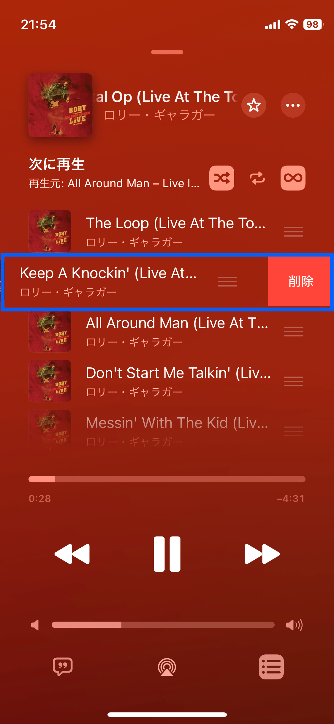 曲の再生中、画面右下のアイコンをタップすると「次に再生」リストが表示されます。除外したい曲を左にスワイプして「削除」アイコンをタップすれば完了です。